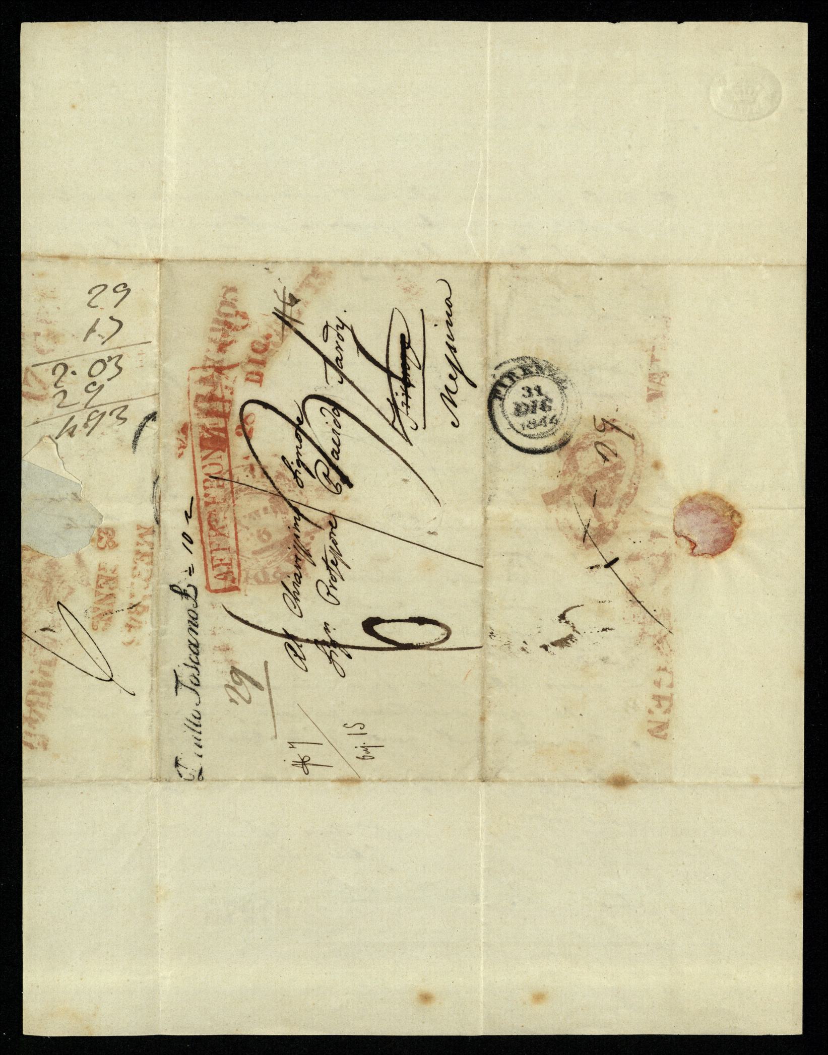 Descrizione: Bifolio, indirizzo, tracce di ceralacca e timbri postali a tergo
