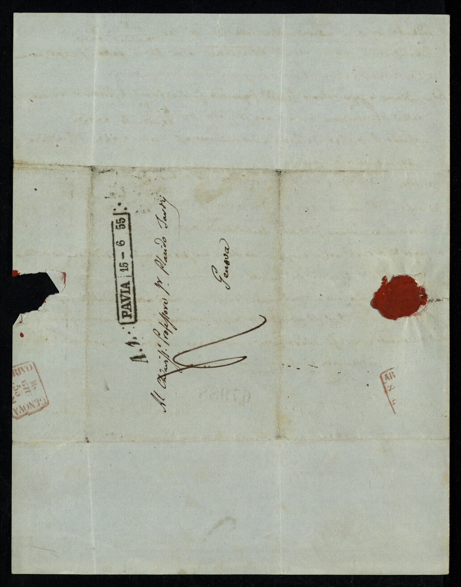Descrizione: carta azzurra, timbri, indirizzo e ceralacca rossa sul retro