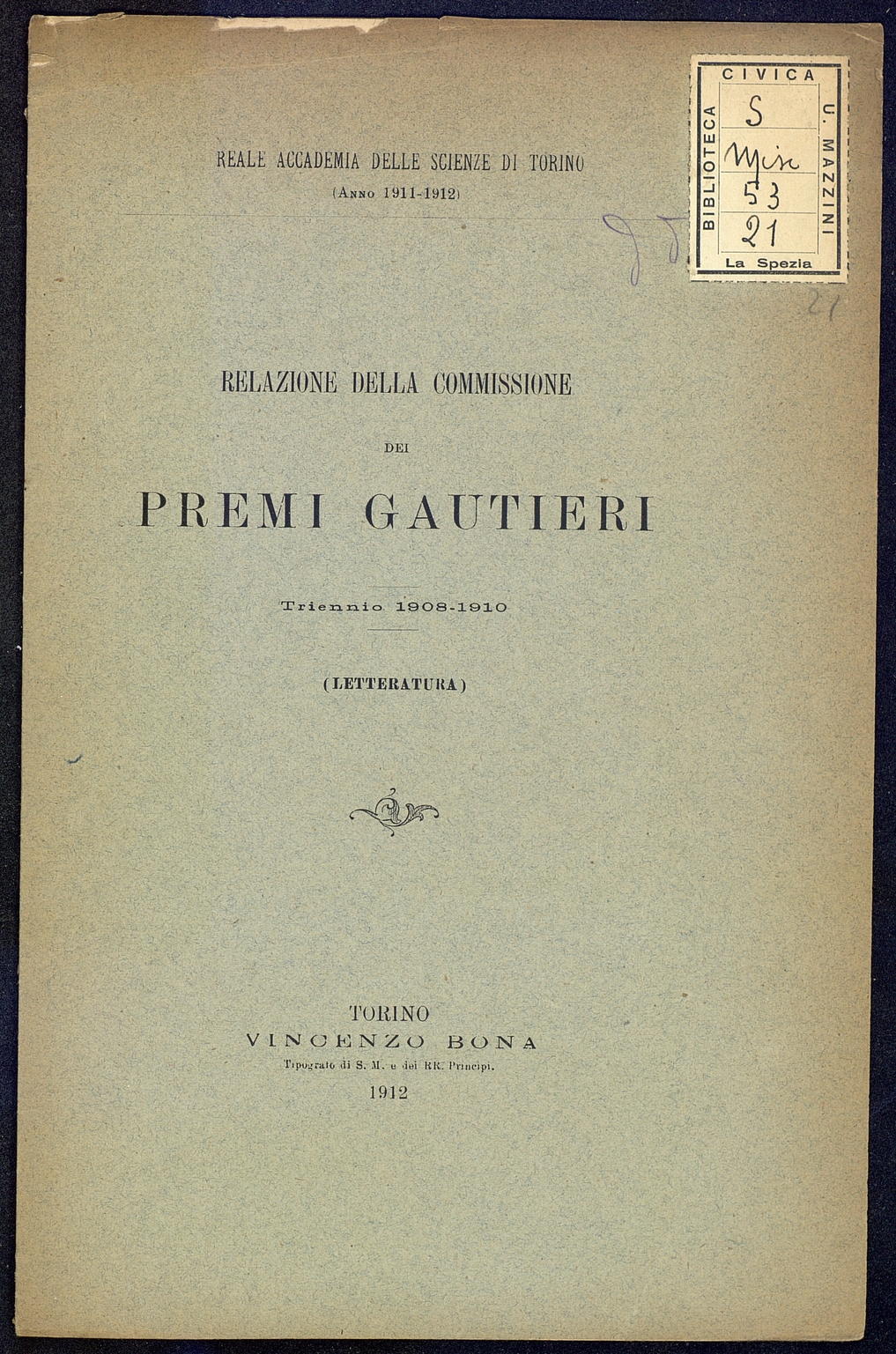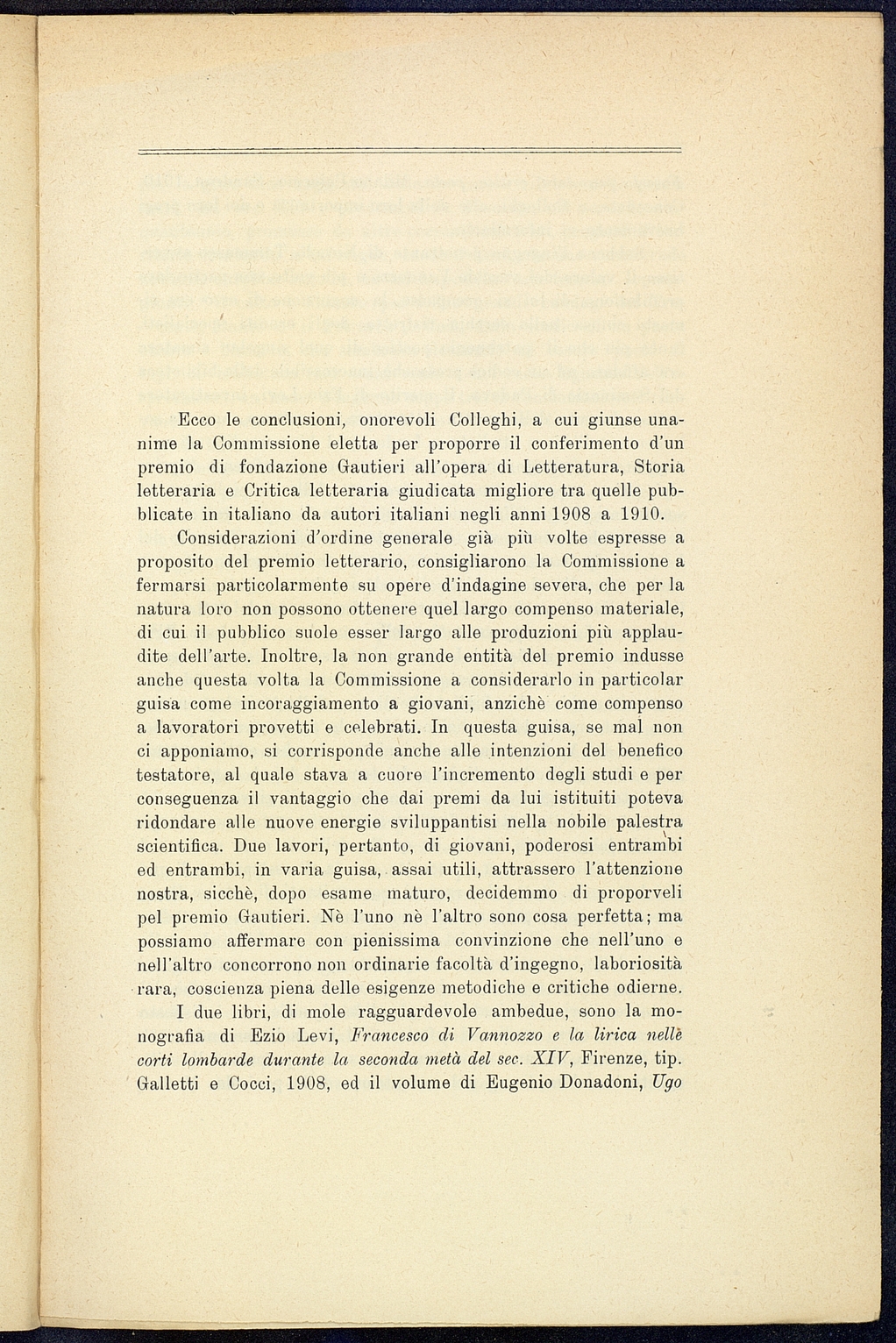 Titolo: Relezione della Commissione dei premi Gautieri triennio 1908-1910 (letteratura)