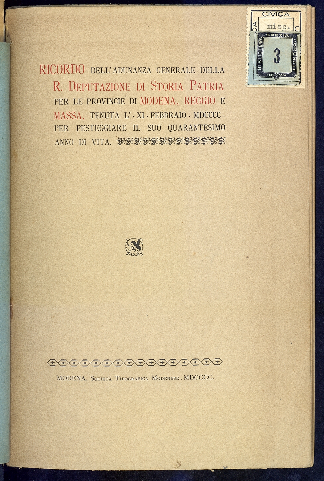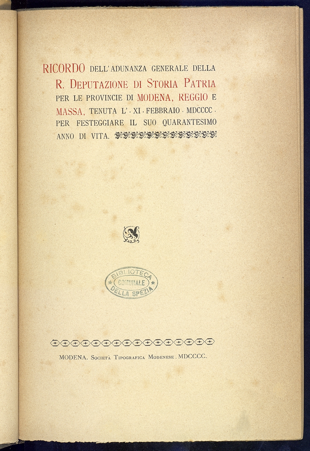 Titolo: Ricordo dell'adunanza generale della R.Deputazione di Storia Patria per le Province di Modena, Reggio e Massa tenuta l'11-2-1900 per festeggiare il suo quarantesimo anno di vita