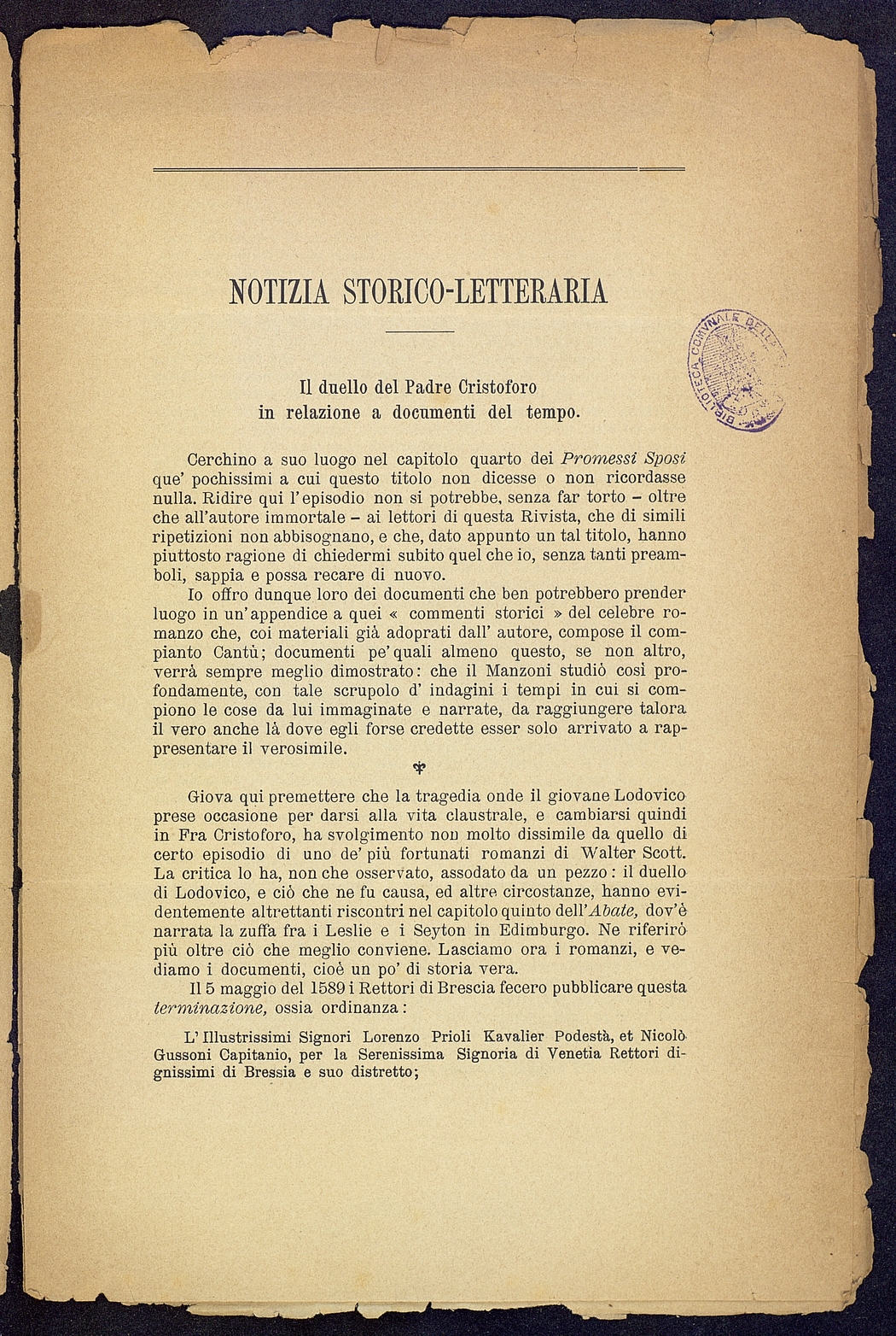 Titolo: Il duello del Padre Cristoforo in relazione a documenti del tempo