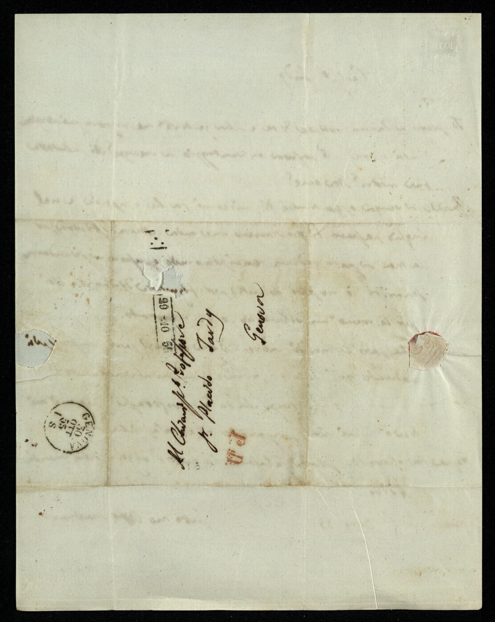 Descrizione: carta grigia, marca in filigr., timbri, ind. e ceralacca rossa sul retro