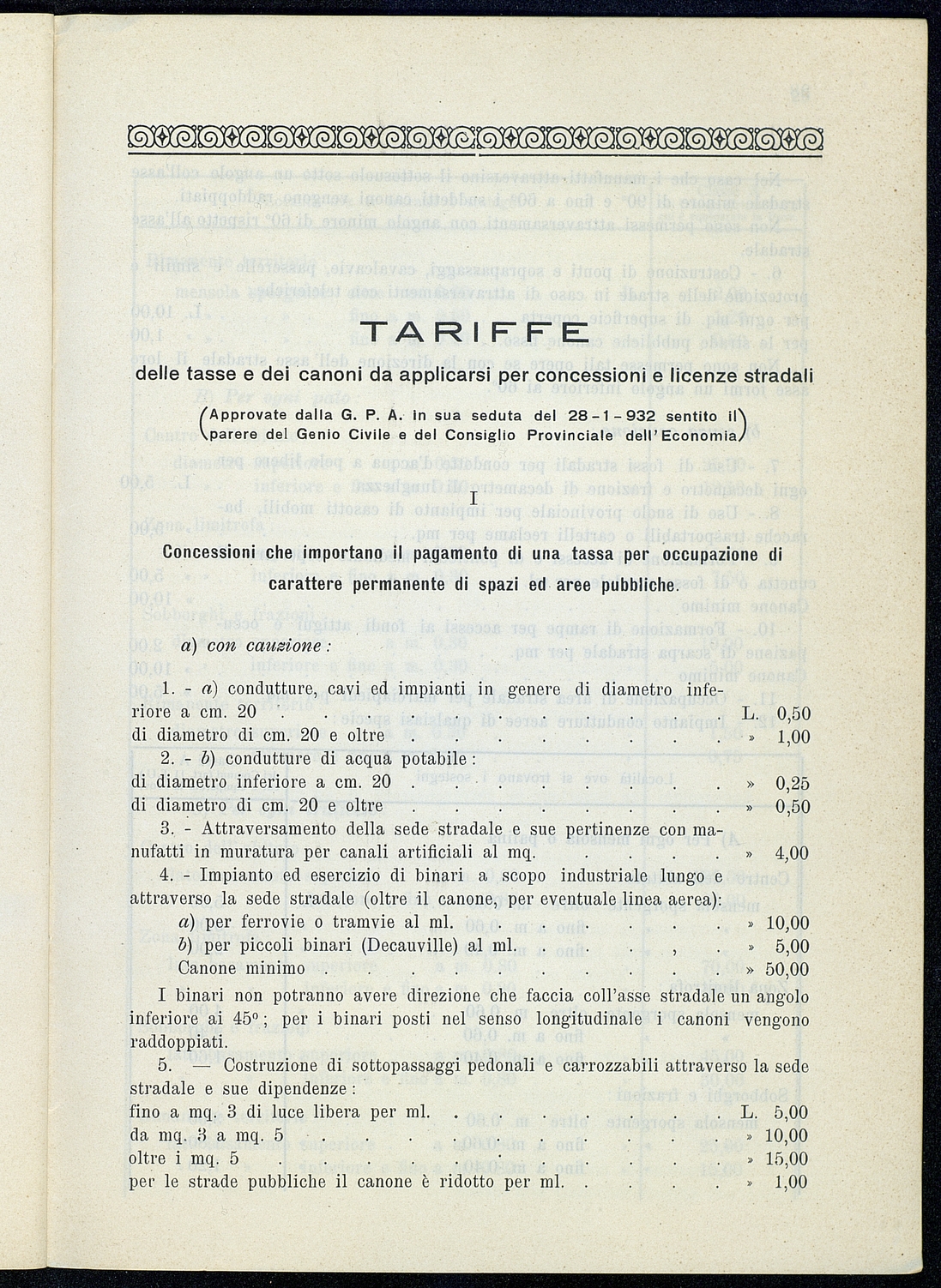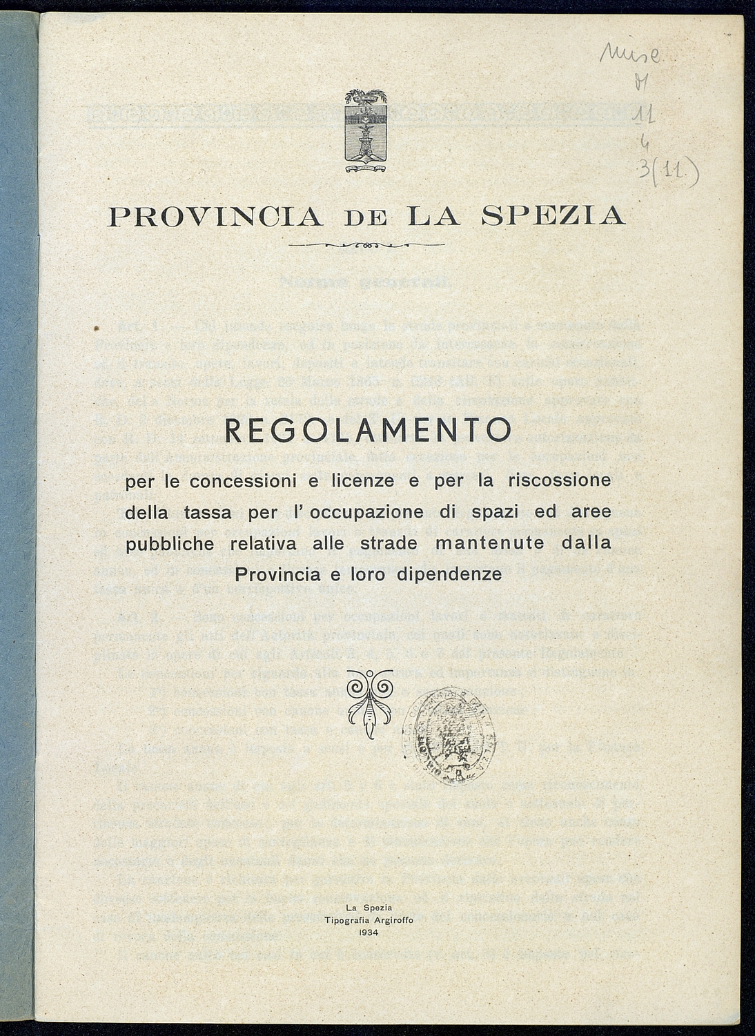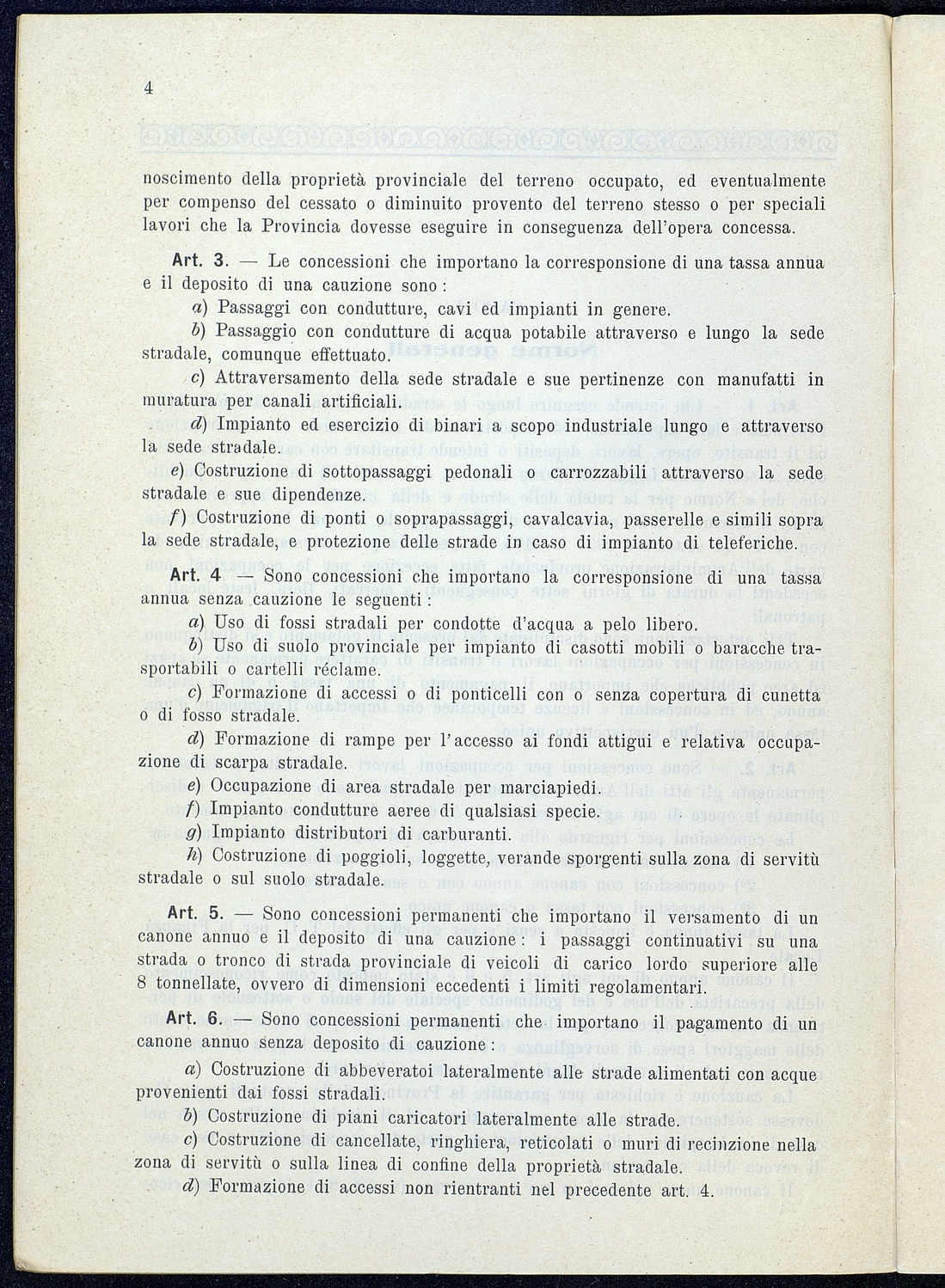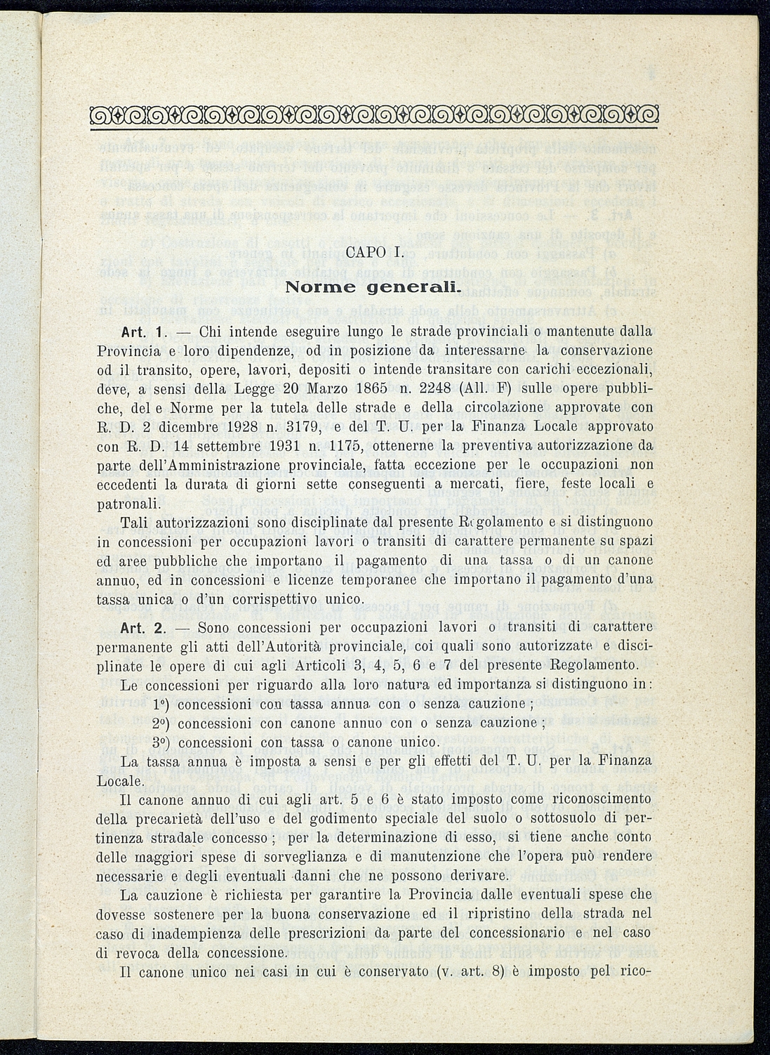 Titolo: Regolamento per le concessioni e licenze e per la riscossione della tassa per l'occupazione di spazi ed aree pubbliche relativa alle strade mantenute dalla Provincia e loro dipendenze Preside sul conto consuntivo 1934