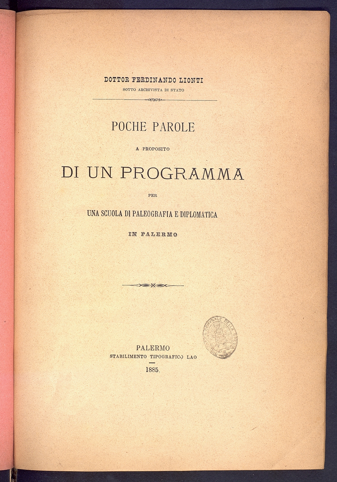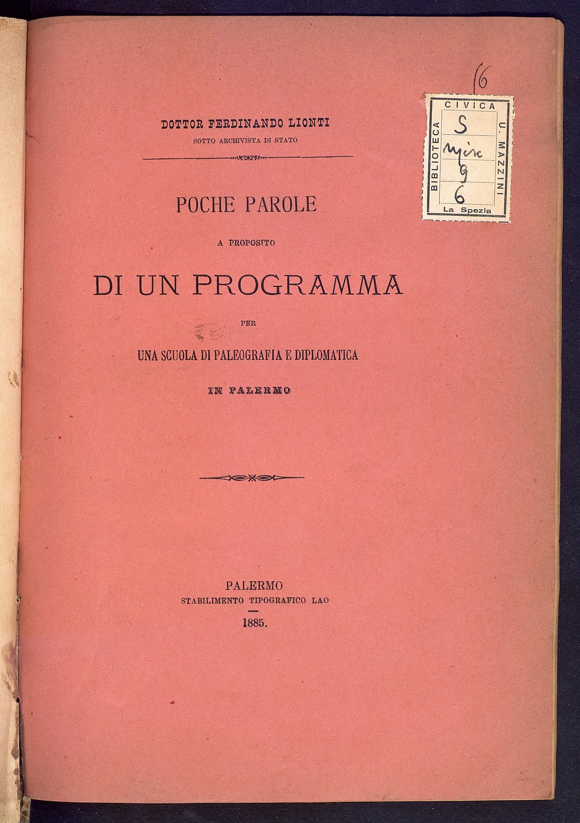 Titolo: Poche parole a proposito di un programma per una scuola di paleografia e diplomatica in Palermo