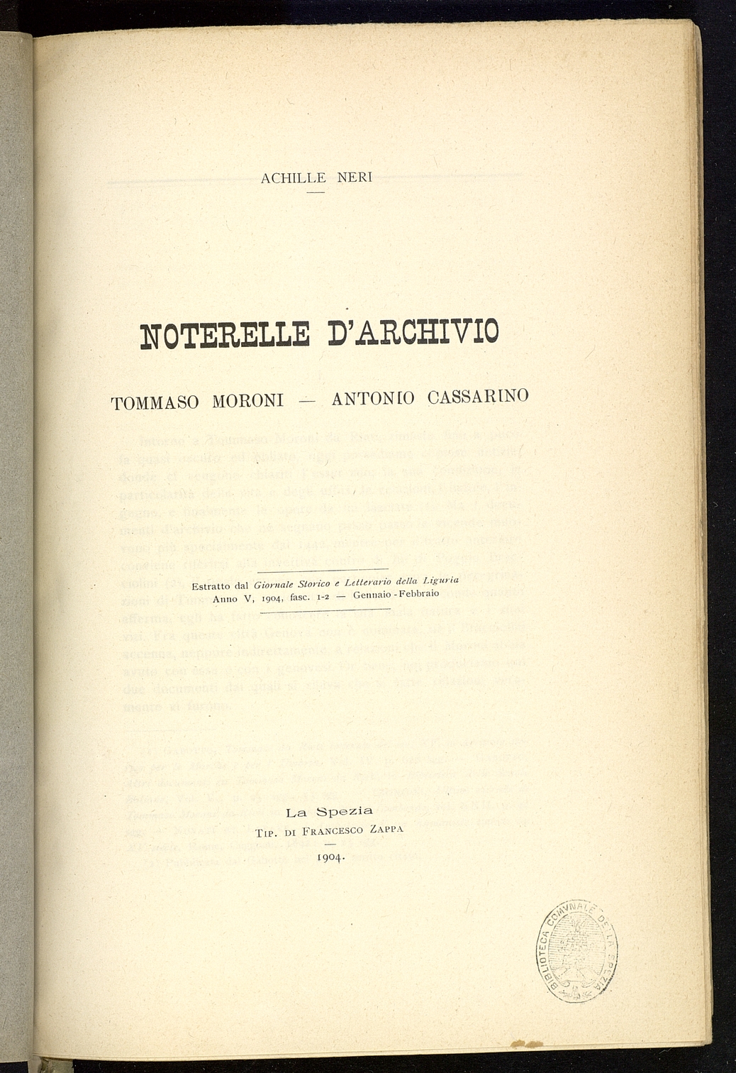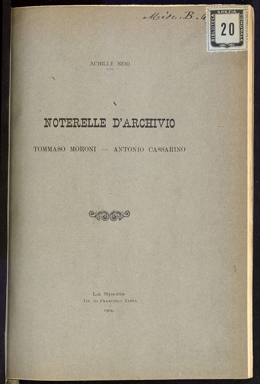 Titolo: Noterelle d'Archivio: Tommaso Moroni - Antonio Cassarino