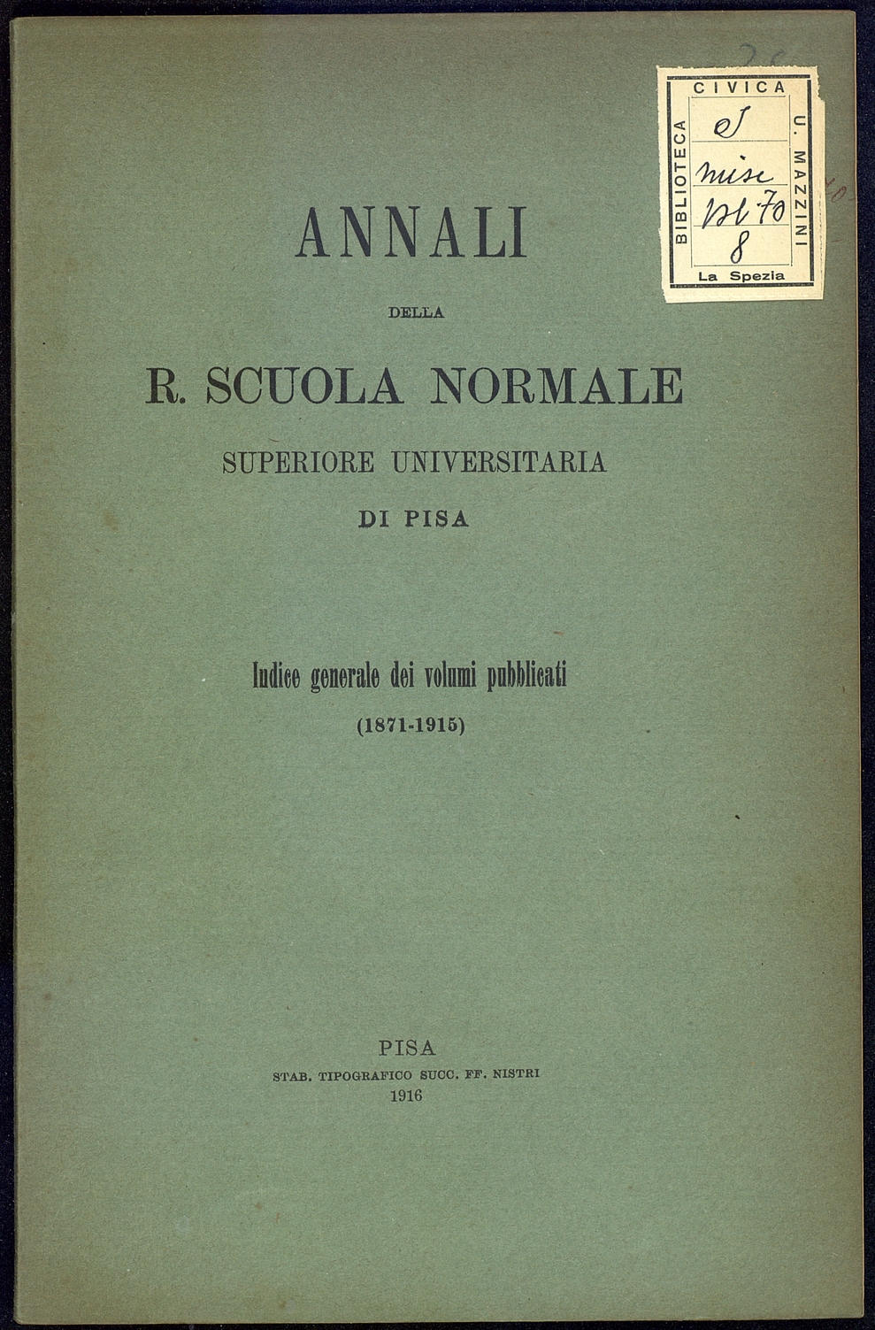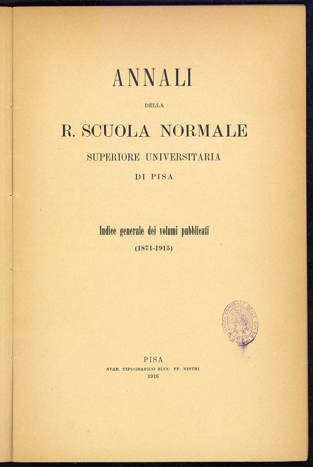 Titolo: Annali della R.Scuola Normale Superiore Universitaria di Pisa -Indice dei volumi pubblicati (1871-1915)