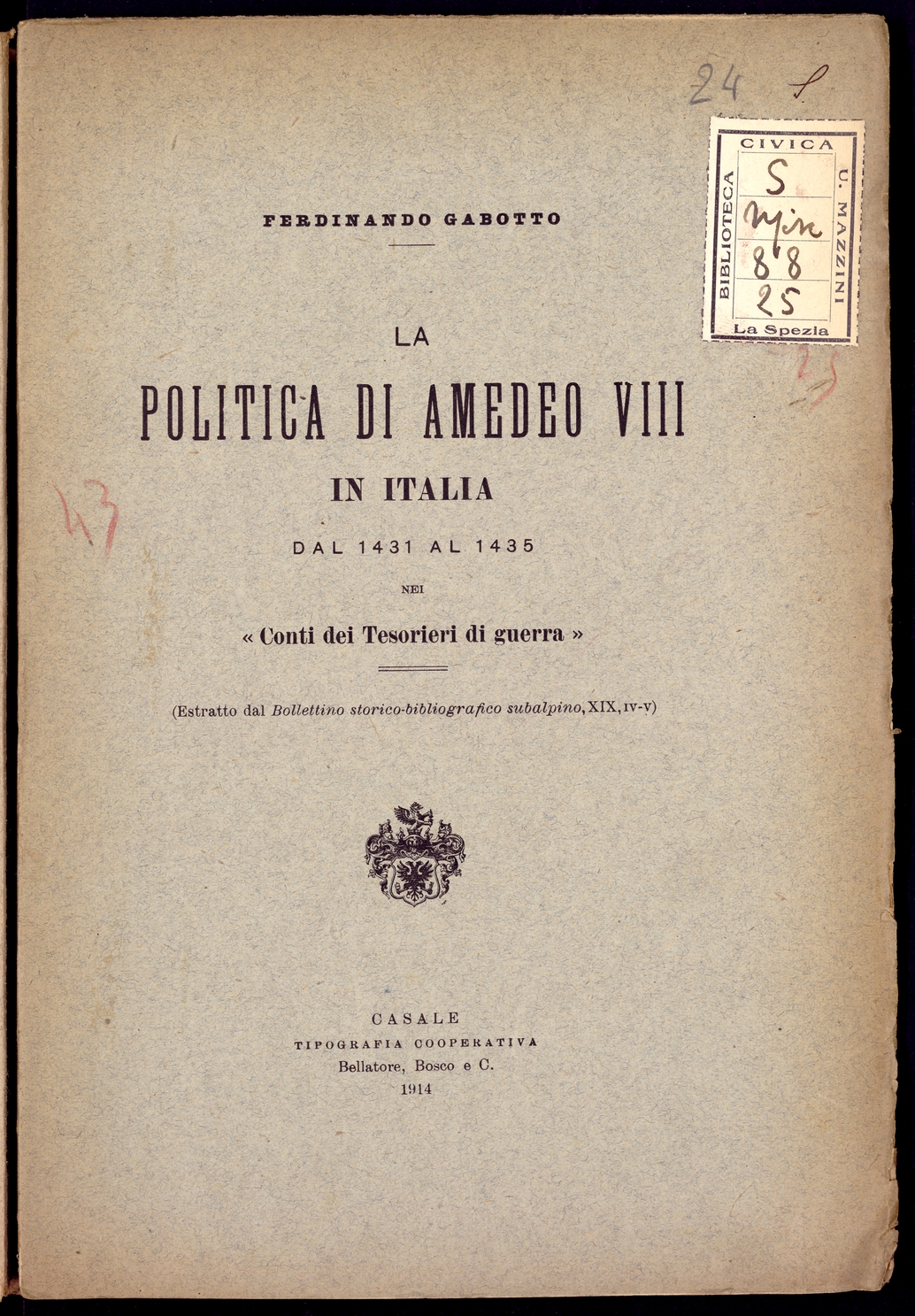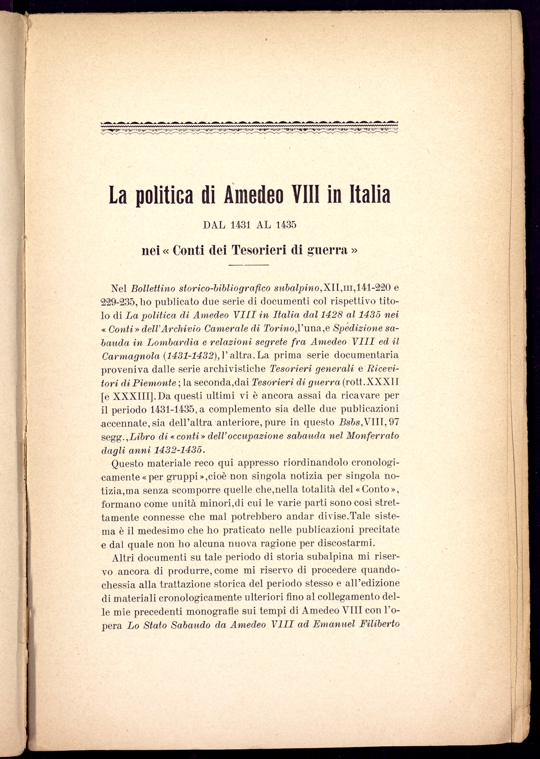 Titolo: La politica di Amedeo VIII in Italia dal 1431 al 1435 nei "Conti dei Tesorieri di guerra