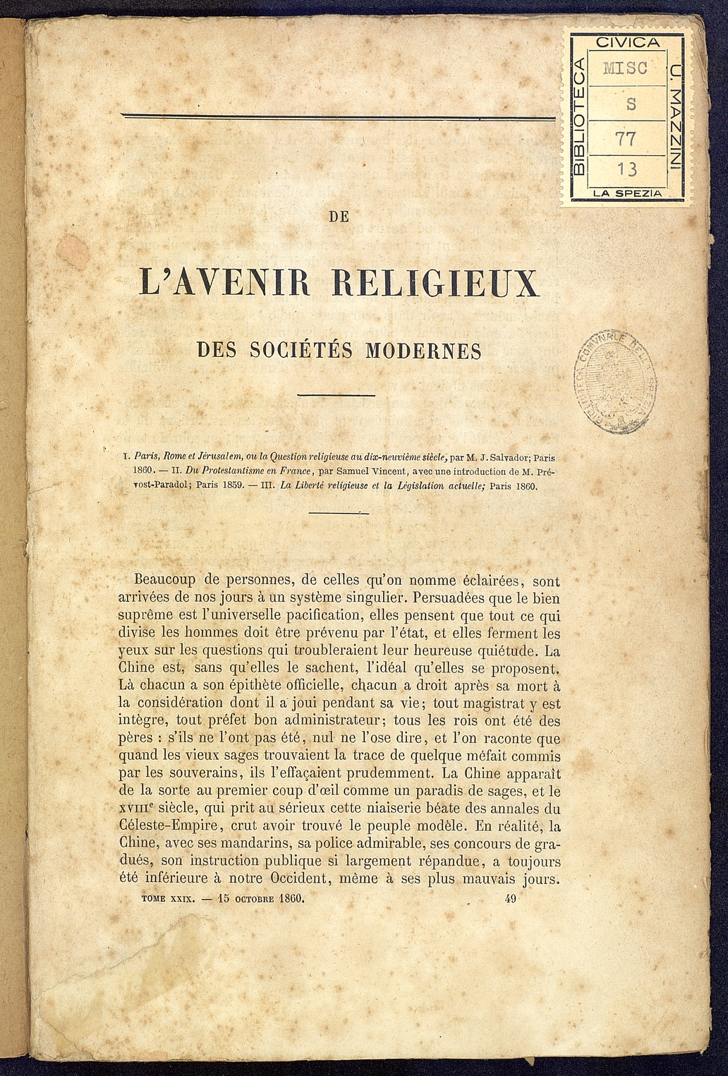 Tipo documento: TestoLivello bibliografico: Monografia Titolo: De l'avenir religieux des societes modernesAutore: Renan E.Data di pubblicazione: 1834Identificativo: MXS077013ARK: ark:/64639/MXS077013ARK: ark:/64639/MXS077013/38157